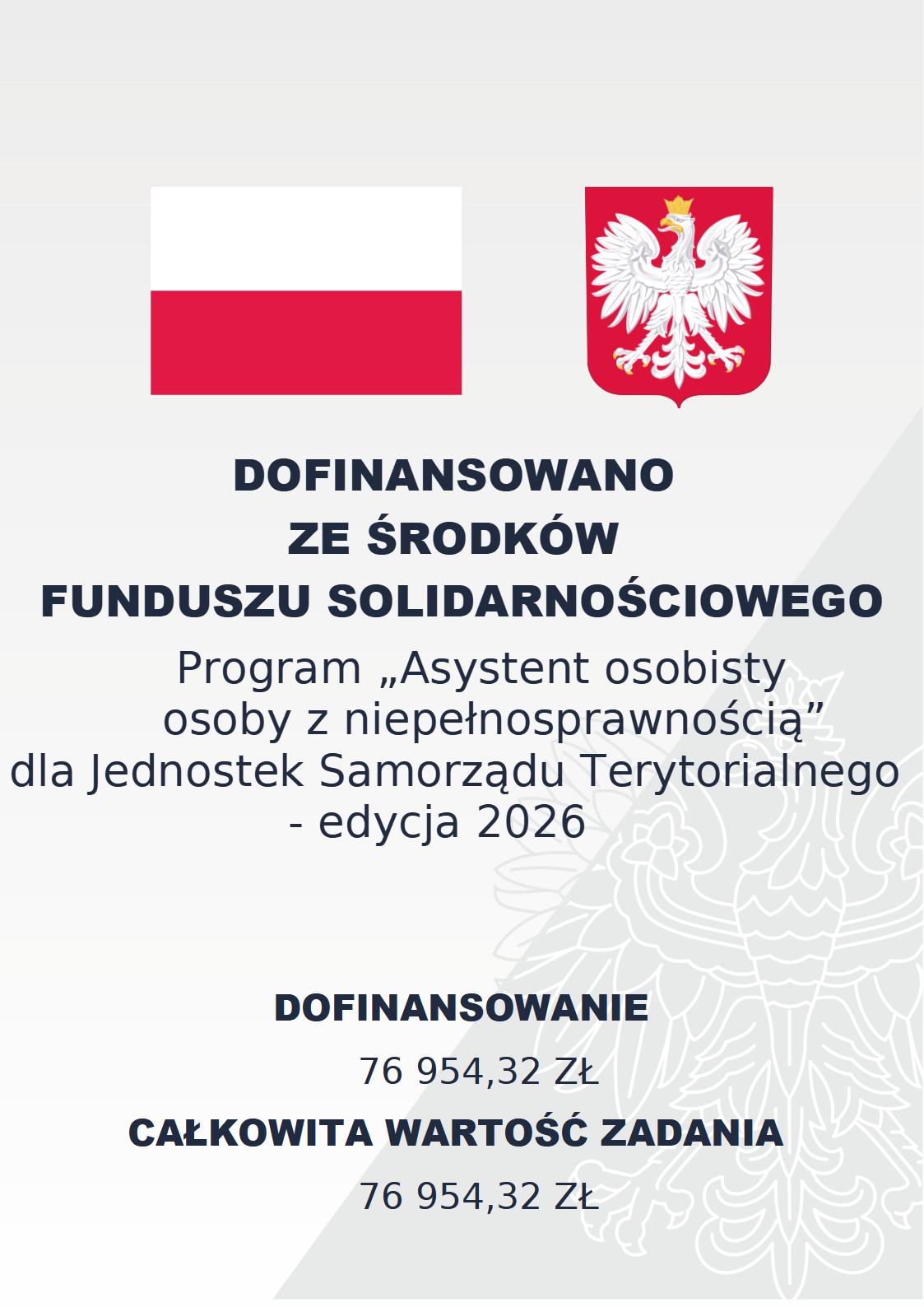 Zadanie dofinansowano ze środków Funduszu Solidarnościowego, w ramach resortowego Programu Ministra Rodziny, Pracy i Polityki Społecznej "Asystent osobisty osoby z niepełnosprawnością" dla Jednostek Samorządu Terytorialnego - edycja 2026
